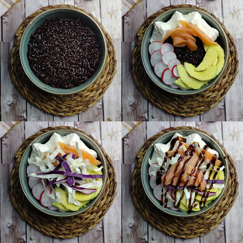 Riprendete il riso e conditelo con tutti gli ingredienti unendo anche l’insalata croccante. Per un tocco finale più gustoso guarnite la bowl con glassa di aceto balsamico.
