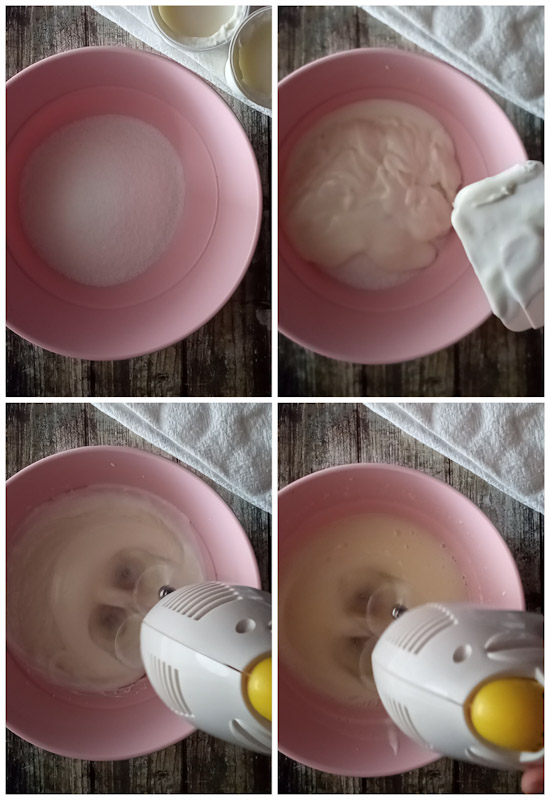 Per realizzare la Torta allo yogurt senza uova e senza farina per prima cosa, in una ciotola, versare lo zucchero e, con l’aiuto di una spatola unire gli yogurt.