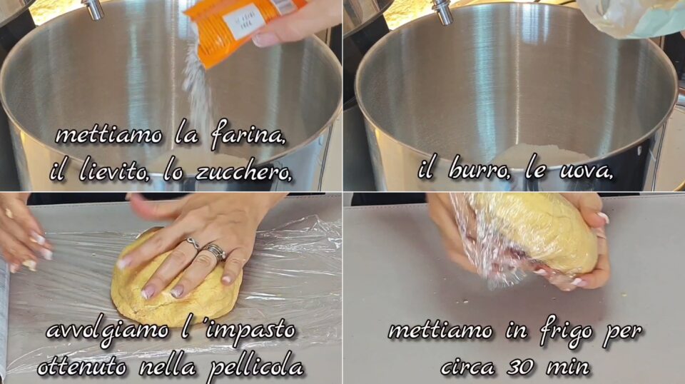 Preparo la base Per prima cosa metto in una ciotola la farina, il lievito, lo zucchero, il burro e le uova. Impasto velocemente fino ad ottenere un panetto liscio e compatto. Avvolgo l’impasto nella pellicola e lo metto in frigorifero per circa 30 minuti.