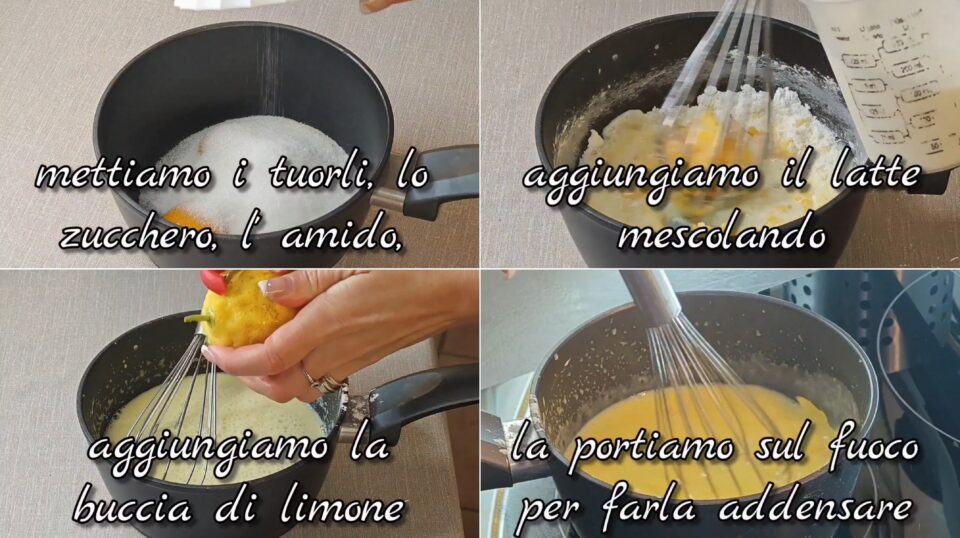 Preparo la crema pasticcera In un pentolino metto i tuorli, lo zucchero e l’amido. Mescolo bene e aggiungo il latte poco alla volta, continuando a mescolare. Aggiungo la scorza di limone e porto sul fuoco.