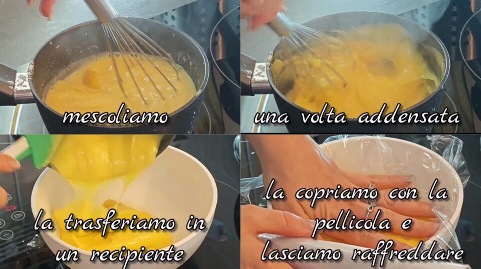 Mescolo continuamente finché la crema si addensa. Quando è pronta la trasferisco in una ciotola, copro con pellicola a contatto e lascio raffreddare.