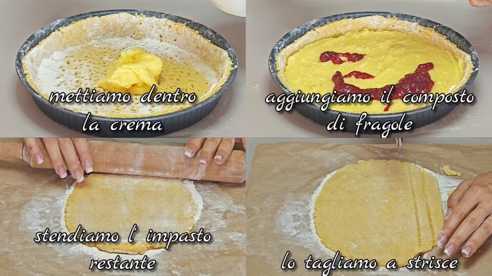 Aggiungo il ripieno Verso dentro la crema pasticcera fredda e la distribuisco su tutta la superficie. Aggiungo sopra il composto di fragole. Decorazione Stendo l’impasto restante e ricavo delle strisce