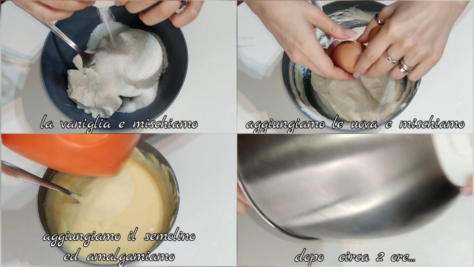 In un recipiente mettiamo la ricotta, lo zucchero, la vaniglia e mischiamo. Aggiungiamo le uova ed amalgamiamo bene. In fine mettiamo il semolino e mischiamo.
