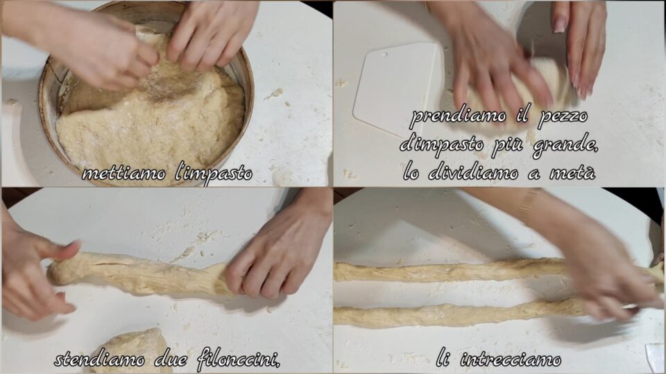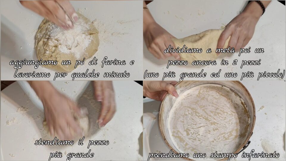 Dopo circa 2 ore prendiamo l’impasto e lo lavoriamo per qualche minuto aggiungendo un po’ di farina se serve. Dividiamo a metà, poi un pezzo lo dividiamo in altri 2 pezzi uno più grande ed uno più piccolo. Stendiamo il pezzo più grande e creiamo la base del dolce dandogli la forma rotonda. Prendiamo uno stampo a cerniera (24 cm) imburrato ed infarinato e mettiamo l’impasto sistemandolo bene sul fondo. Prendiamo il pezzo d’impasto restante più grande, lo dividiamo a metà e diamo forma a 2 filonccini. Li intrecciamo tra di loro e li mettiamo intorno allo stampo per creare il bordo. Sistemiamo bene poi aggiungiamo il ripieno preparato. Prendiamo l’impasto restante (il pezzo più piccolo) e facciamo 4 filonccini piccoli. Li intrecciamo tra di loro formando 2 pezzi. Li mettiamo sopra sovrapposti facendo il segno della croce. Spennelliamo l’impasto con un tuorlo d’uovo e mettiamo in forno a 180° per circa 40 min.