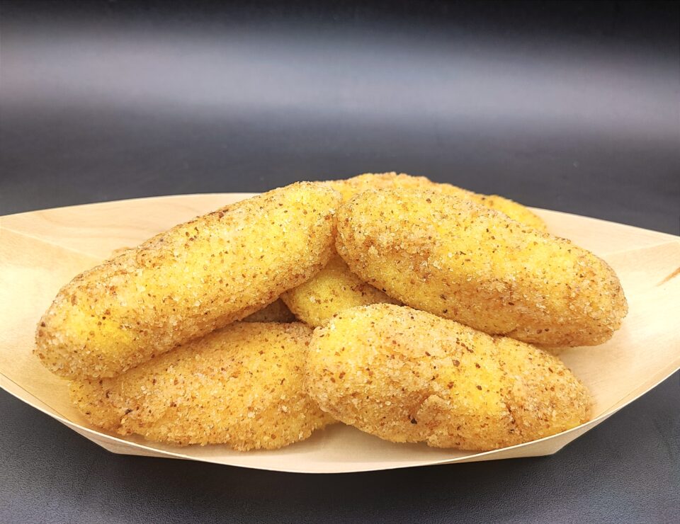 In un recipiente mettiamo la farina, un po’ di sale, l’acqua ed amalgamiamo. Passiamo le crocchette prima nella pastella poi nel pangrattato.