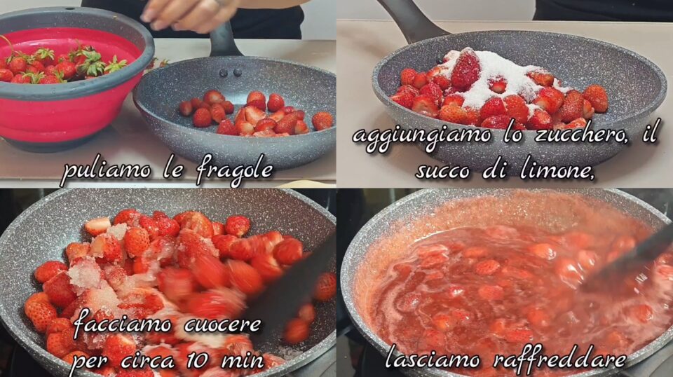 Prepariamo le fragole Puliamo e tagliamo le fragole. Le mettiamo in un pentolino con lo zucchero e il succo di limone. Facciamo cuocere per circa 10 minuti, mescolando di tanto in tanto. Lasciamo raffreddare completamente.