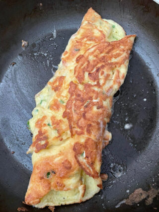 Cominciate ad arrotolare l’omelette, con l ‘aiuto di una paletta di legno cuocendola a fuoco lento.