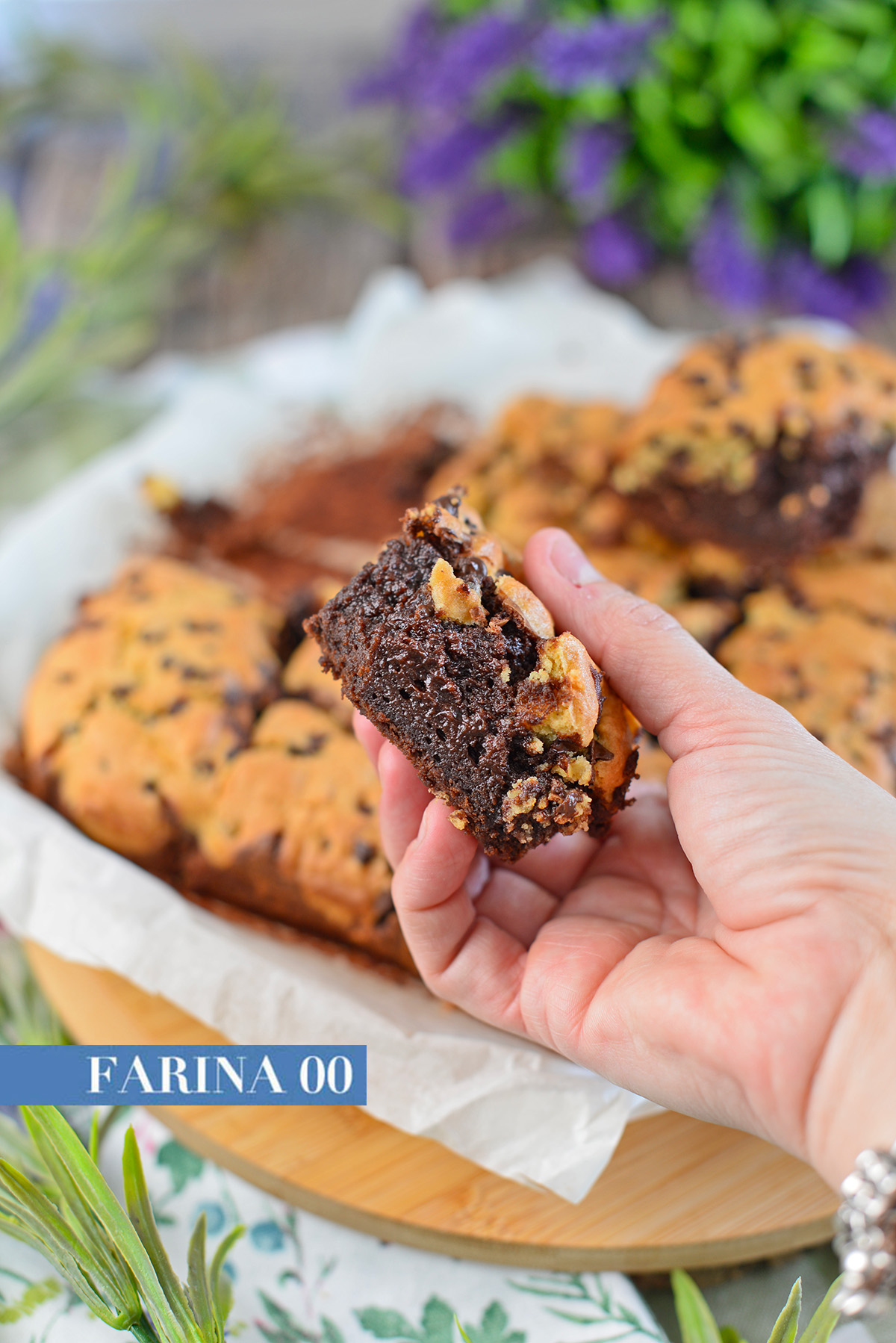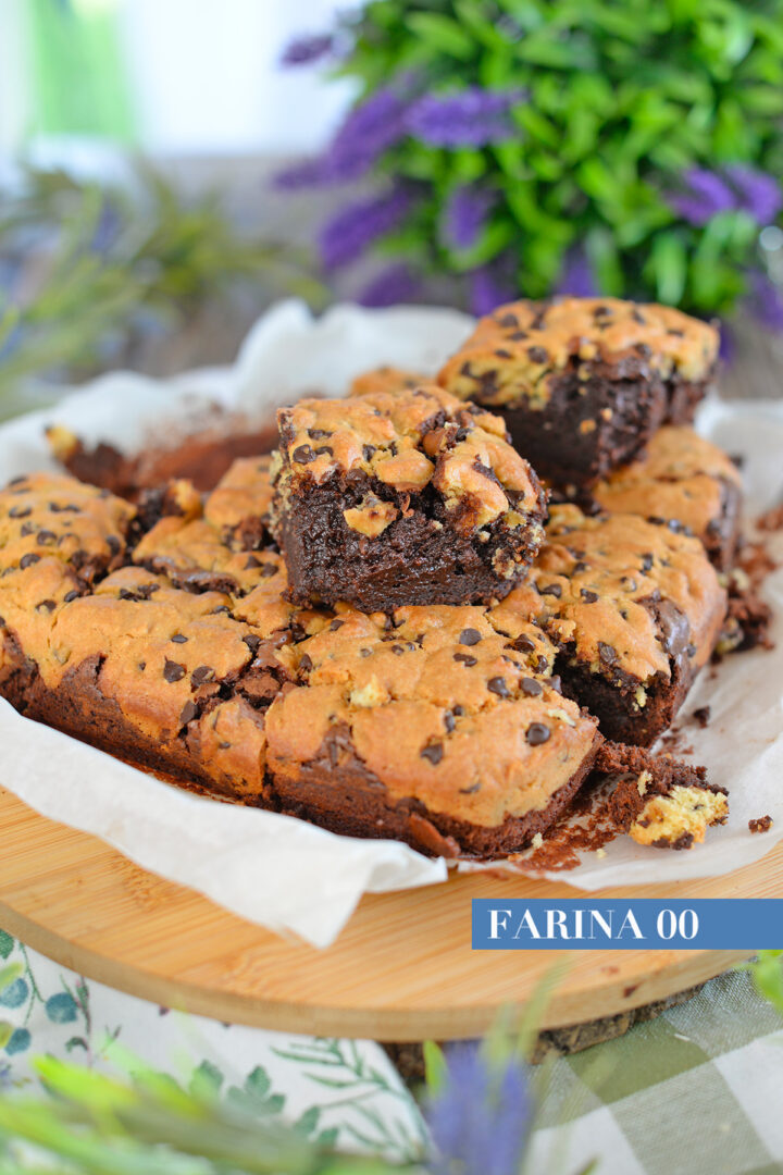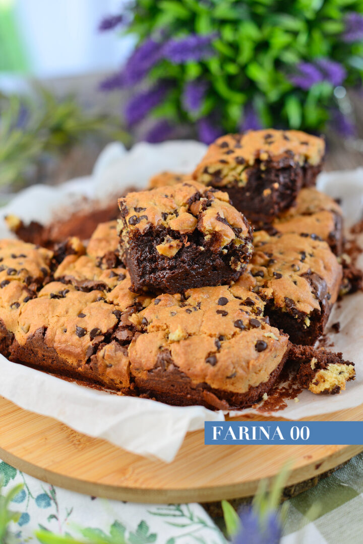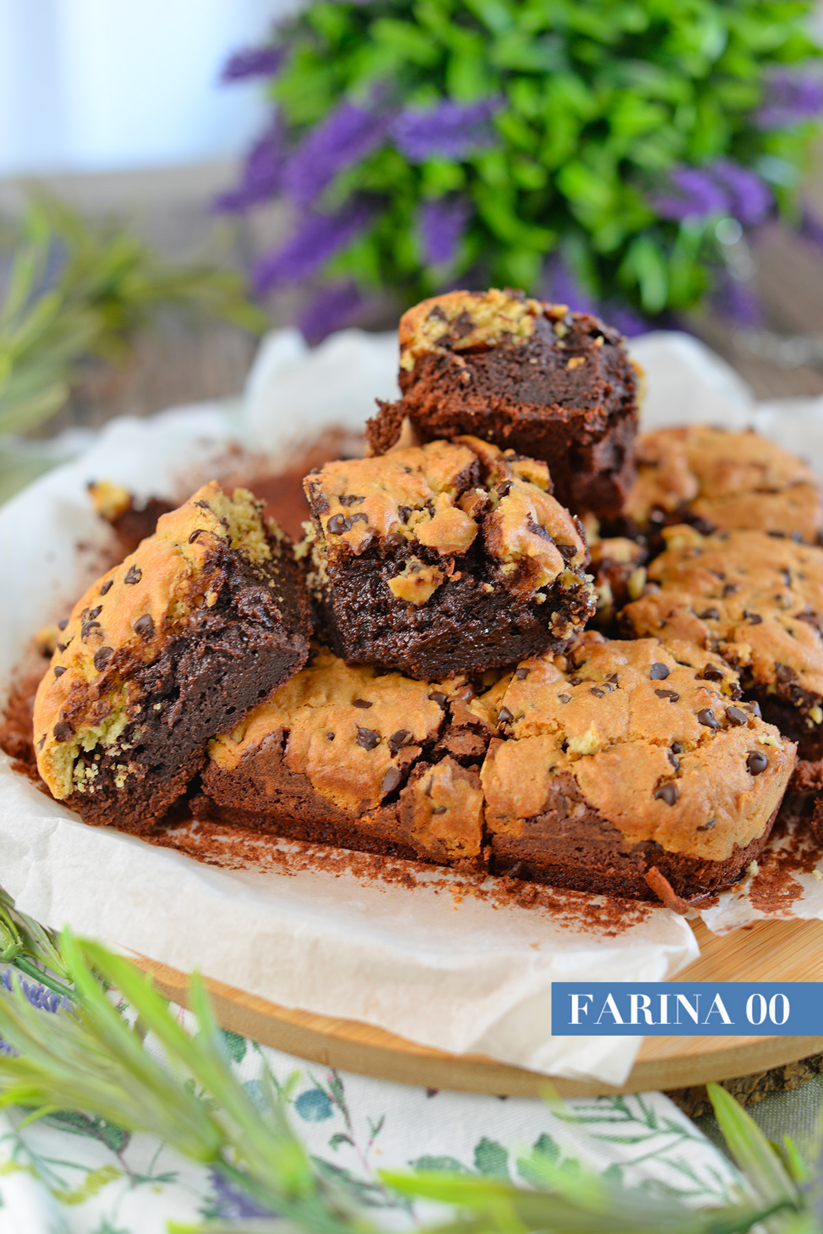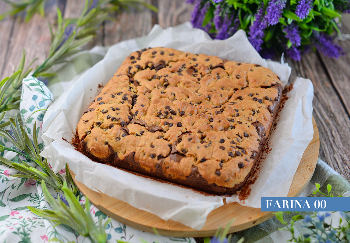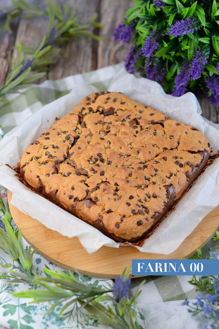 Una torta a metà fra i Brownies e i biscotti cookies … due strati per due consistenze diverse : una base cremosa al cioccolato che si scioglie in bocca, e uno strato superiore fragrante al biscotto… un dolce assolutamente da provare.