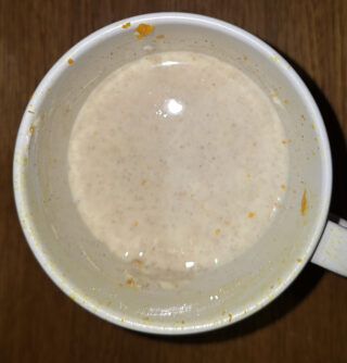 In una tazza mescolare lo yogurt greco con cannella, vanillina, pizzico sale, buccia d’arancia grattugiata e acqua.