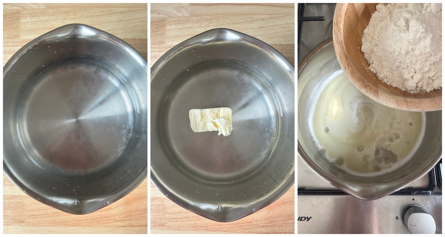 Per preparare i bignè in friggitrice ad aria, come prima cosa prepara l’impasto base della pasta choux. In una pentola versa l’acqua, aggiungi il burro e un pizzico di sale e cuoci fino a che non inizia a bollire. Unisci tutta la farina.