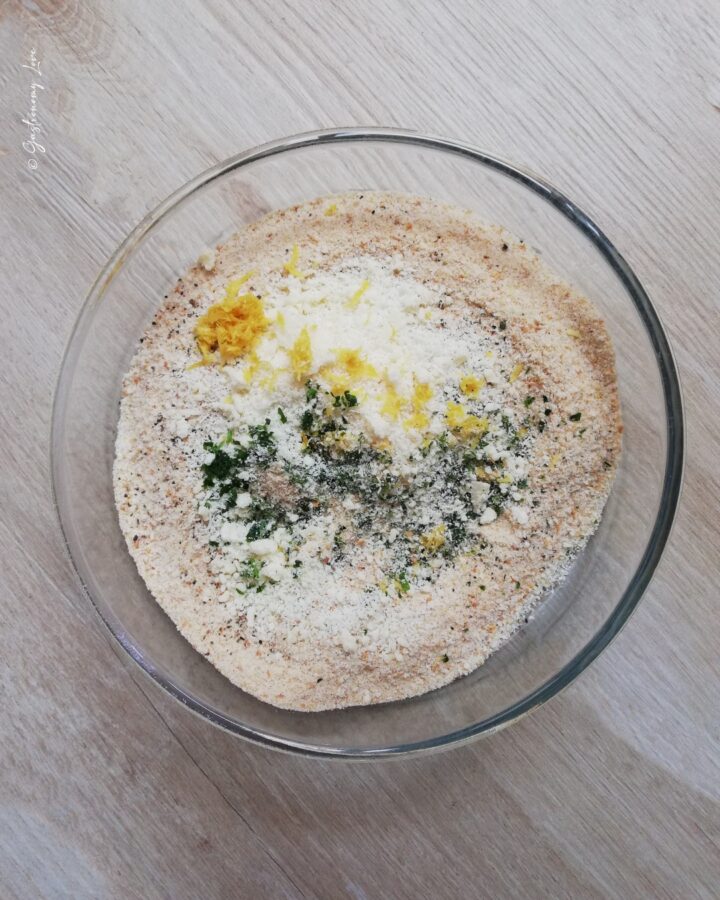 In una ciotola unisci il pangrattato, il formaggio grattugiato, una presa di sale, una presa di pepe, un ciuffo di prezzemolo fresco tritato, la scorza grattugiata di 1 limone, 1 spicchio d’aglio tritato (facoltativo) e abbondante origano secco. Mescola il tutto con una forchetta.