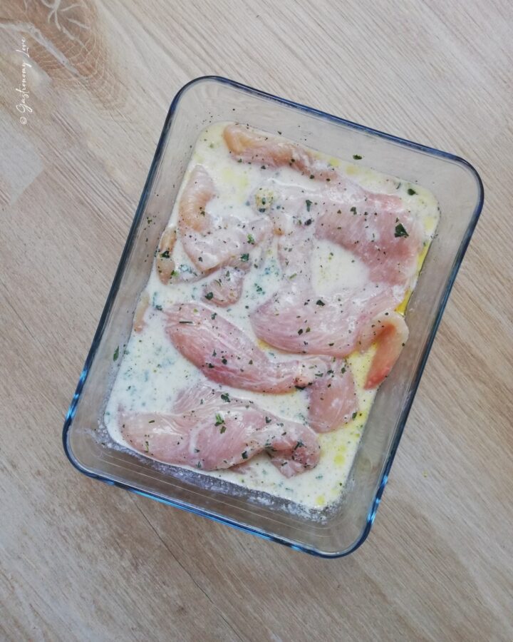 Unisci anche le fette di petto di pollo (meglio se non troppo sottili), mescola con le mani per insaporire uniformemente il pollo, dopodiché sigilla con pellicola e conserva in frigo per almeno 30 minuti (puoi tenerle in ammollo anche qualche ora, purché in frigo).