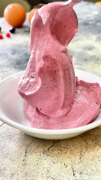 Frulla bene finché non ottieni una purea liscia e compatta. Usarli congelati è fondamentale: il freddo dei frutti aiuterà il composto a montare meglio quando aggiungi gli albumi.