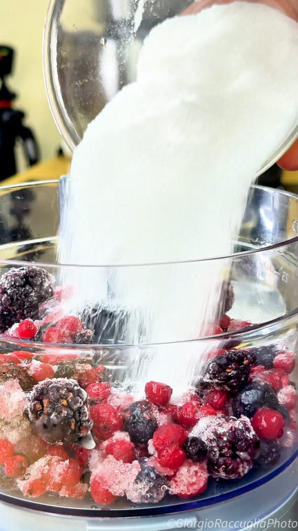 Per preparare lo spumone ai frutti di bosco, inserisci nel mixer i frutti di bosco ancora surgelati