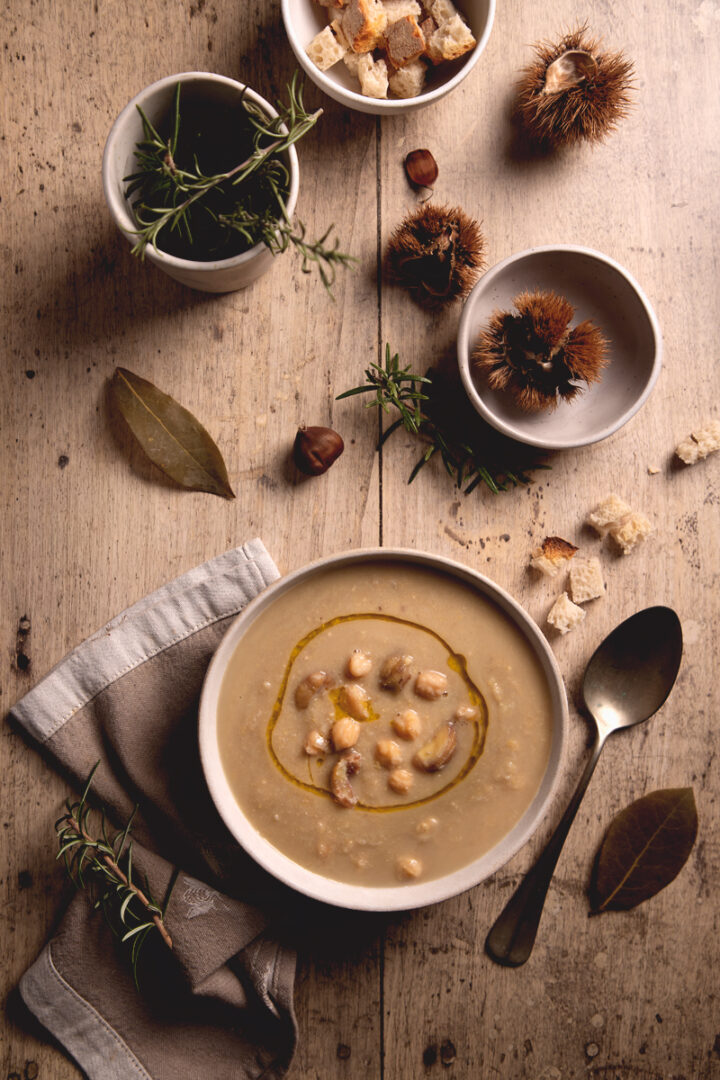 In una casseruola scalda l’olio extravergine con uno spicchio d’aglio in camicia e un rametto di rosmarino. Aggiungi la cipolla dorata e lascialo appassire a fuoco dolce, senza farlo colorire. Unisci i ceci cotti e le castagne spezzettate grossolanamente, mescola e versa il brodo vegetale caldo. Lascia sobbollire la zuppa per 20–25 minuti, mescolando ogni tanto. A metà cottura schiaccia con il dorso del cucchiaio o frulla con il minipimer una parte delle castagne per rendere il brodo più cremoso. Regola di sale e pepe,