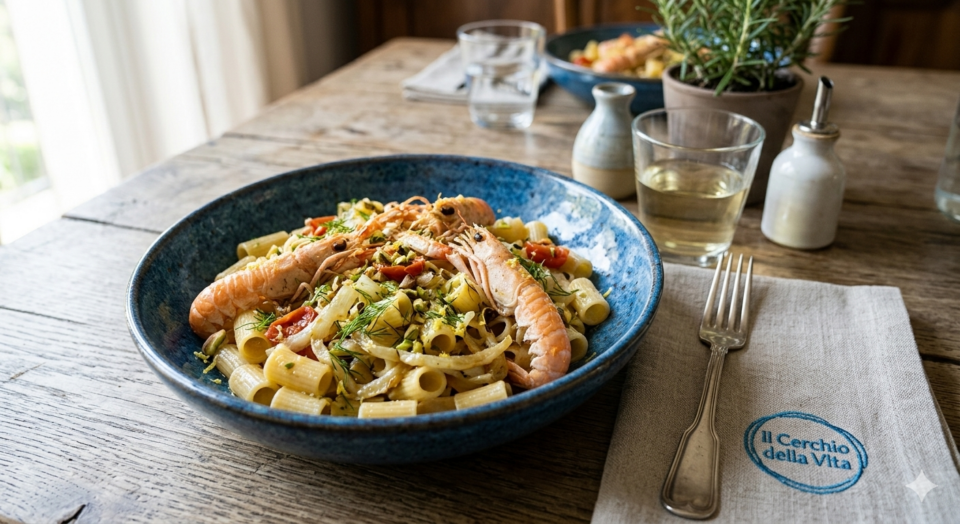 Le mezze maniche sono ideali perché raccolgono il condimento all’interno, ma il “cerchio della vita” accoglie tutti! Ottimi i paccheri (per un piatto più elegante) o degli spaghetti grossi se preferisci la pasta lunga che si avvolge intorno allo scampo.