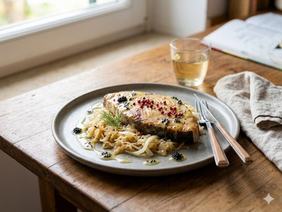Un incontro inaspettato dove la delicatezza del pesce spada si accende con il profumo del pepe rosa e la vivacità dei crauti. Un piatto che sa di festa, ma si prepara con la semplicità dei gesti quotidiani, perfetto per chi vuole stupire con leggerezza e un pizzico di originalità.