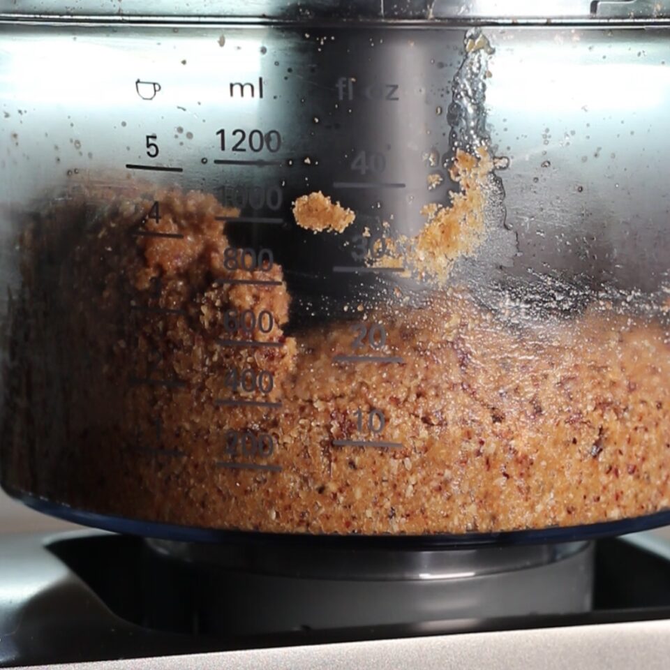 Nel Multipro food processor Kenwood o un robot da cucina inserite i biscotti, la frutta disidratata e frullate fino a ridurre tutto in polvere. Aggiungete il burro fuso e frullate ancora.