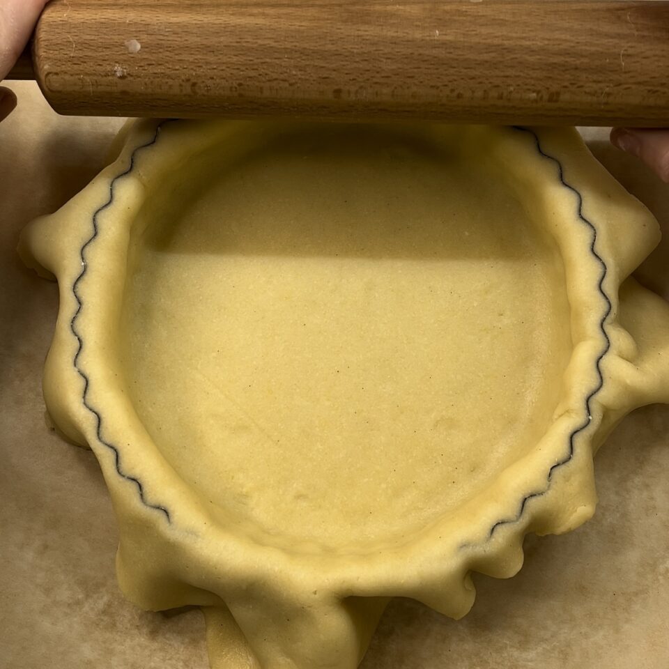 Con la pasta frolla bianca, dopo averla stesa con il mattarello, foderate la base dello stampo, fatela aderire ai bordi e tagliate la parte in eccesso.