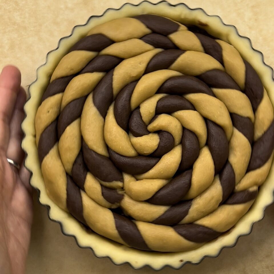 La crostata con crema frangipane al cacao è un dolce realizzato con tre tipi diversi di pasta frolla e un ripieno morbidissimo e aromatizzato al rum. Per realizzare questa torta ho preparato una pasta frolla semplice alla vaniglia, un’altra leggermente ambrata con lo zucchero di canna e una terza frolla al cacao. Il ripieno è una crema frangipane e la decorazione è una spirale doppio gusto, molto particolare.