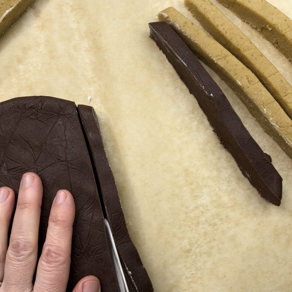 A questo punto realizzate la parte superiore della torta. Ricavate delle strisce non troppo sottili dagli altri impasti(cacao e zucchero di canna).