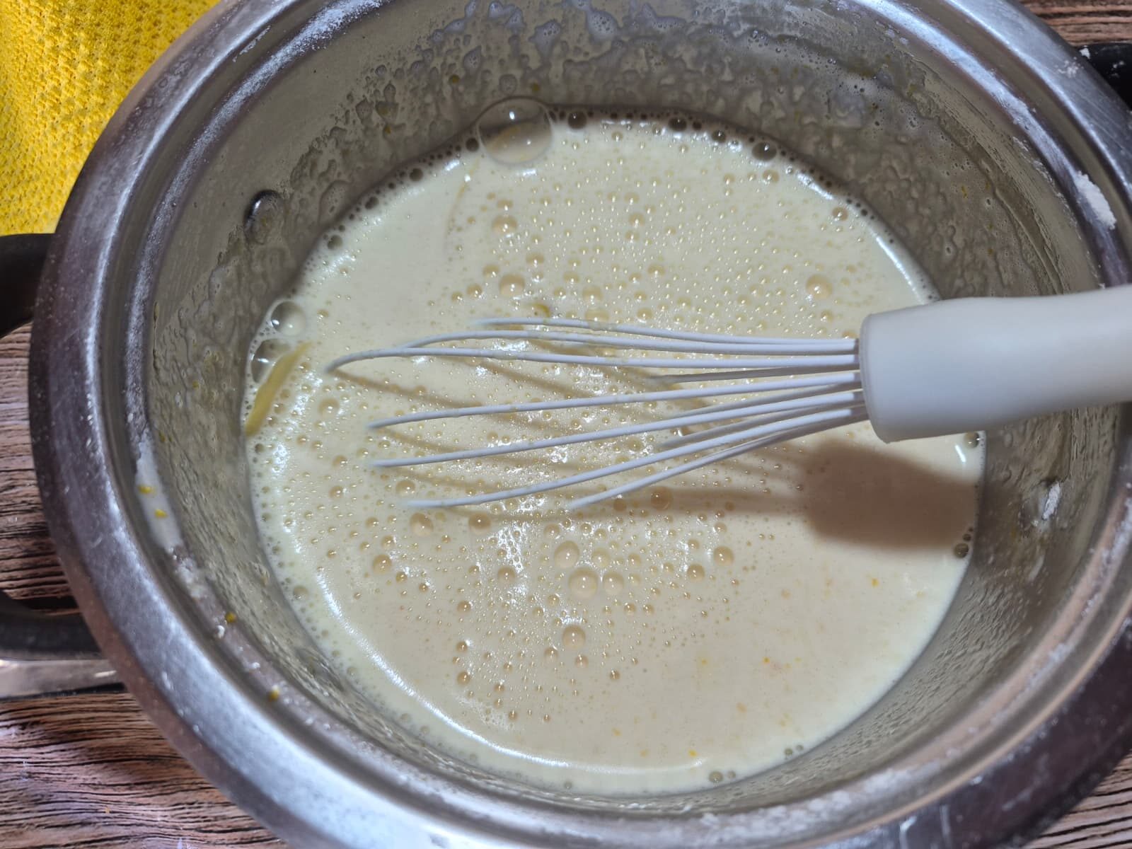 Ora, riaccendi il latte infuso e, quando è ben caldo, versalo a filo sul composto di uova, mescolando vigorosamente con una frusta.