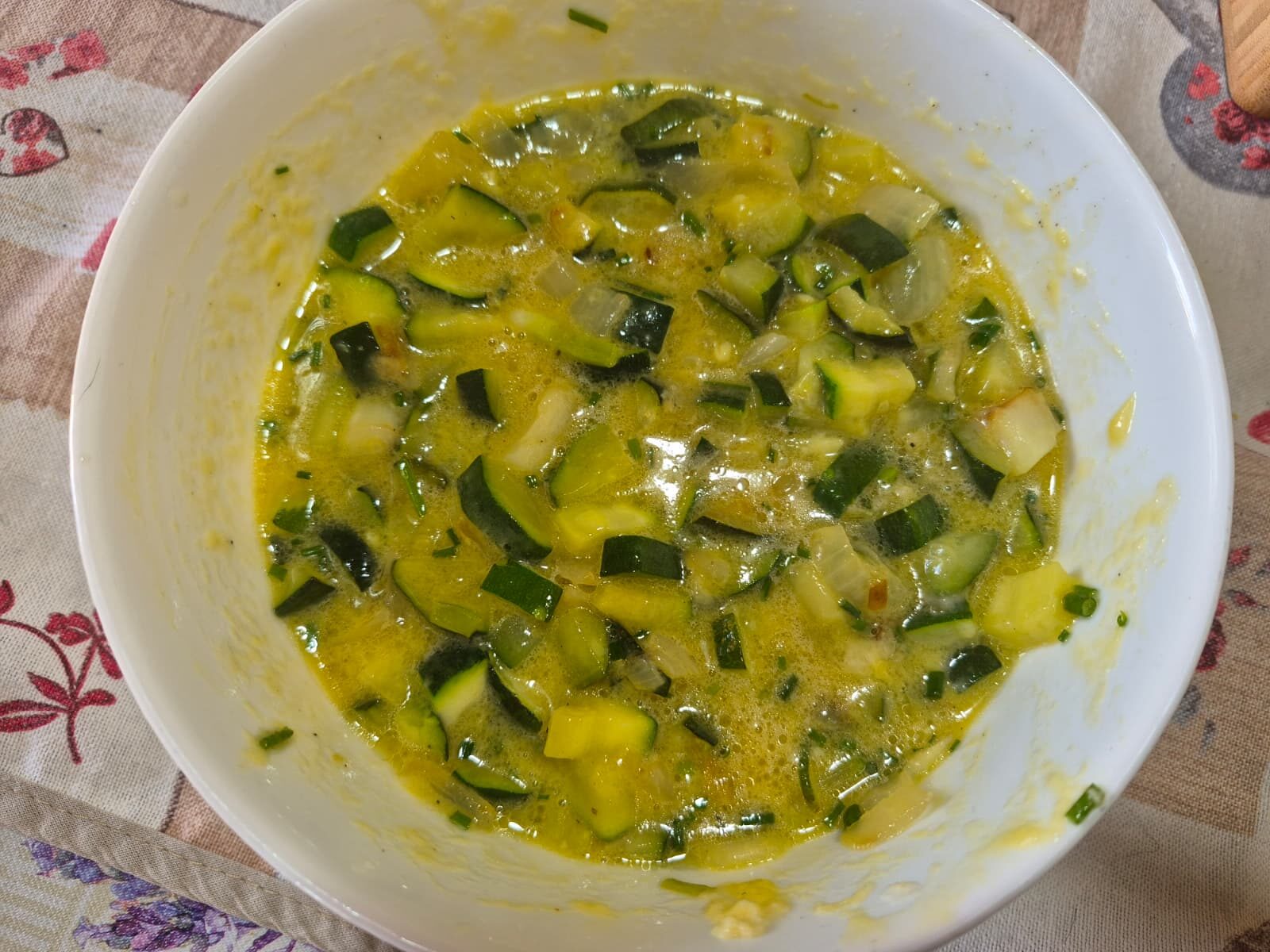 Non aggiungere mai le zucchine e i cipollotti bollenti direttamente nelle uova crude. Se sono troppo caldi, inizieranno a cuocere l’uovo istantaneamente, creando dei grumi. Lasciali intiepidire 2 minuti: la tua frittata sarà molto più omogenea e soffice.