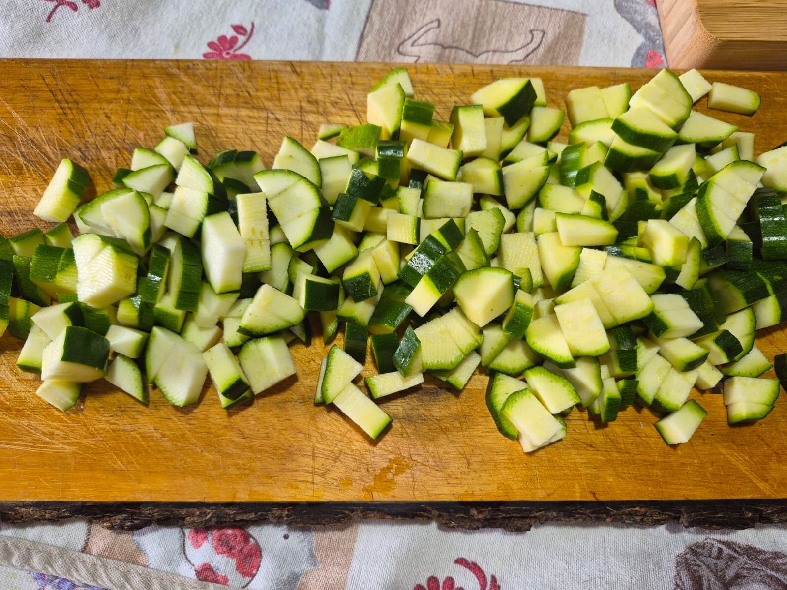 Dopo aver lavato e spuntato le zucchine, tagliatele a cubetti di uguale misura.