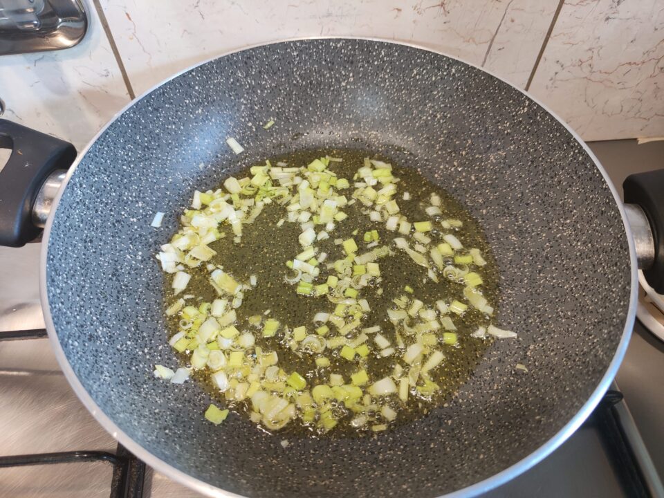 A questo punto tagliate finemente la cipolla e fatela soffriggere con dell’olio EVO in una pentola.