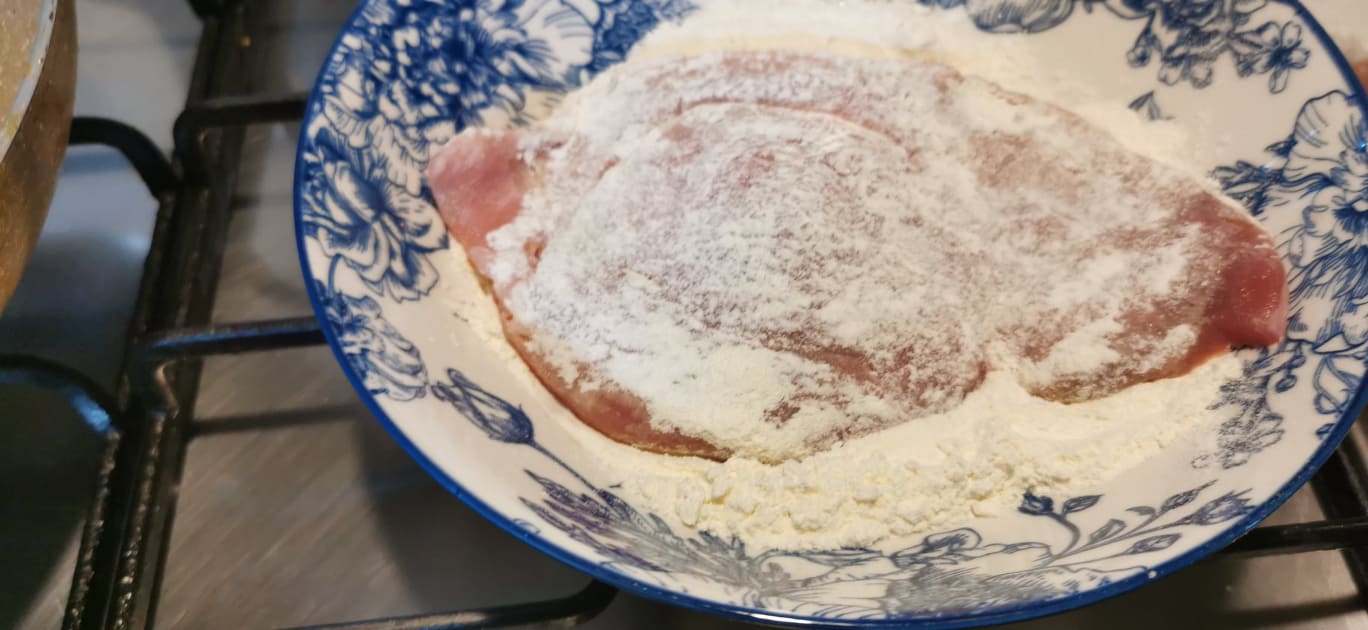 Passa le fettine di pollo nella farina, avendo cura di coprirle uniformemente e di eliminare la farina in eccesso, scuotendole leggermente.