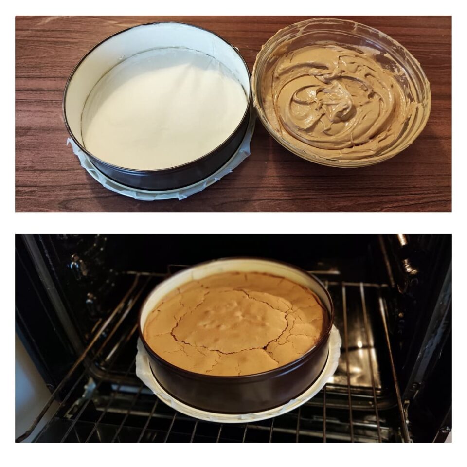 Imburro e infarino una tortiera da 18 cm, verso l’impasto e livello la superficie. Cuocio in forno statico preriscaldato a 170–175 °C per circa 30–35 minuti. Lo stecchino deve uscire leggermente umido ma senza impasto crudo.
