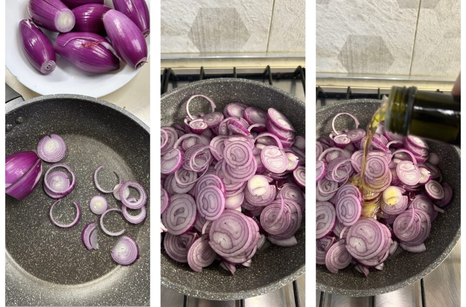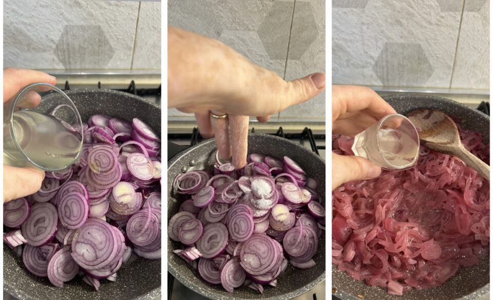 Quando le cipolle si saranno ammorbidite versate il resto dell’aceto e lo zucchero e lasciate evaporare di nuovo.