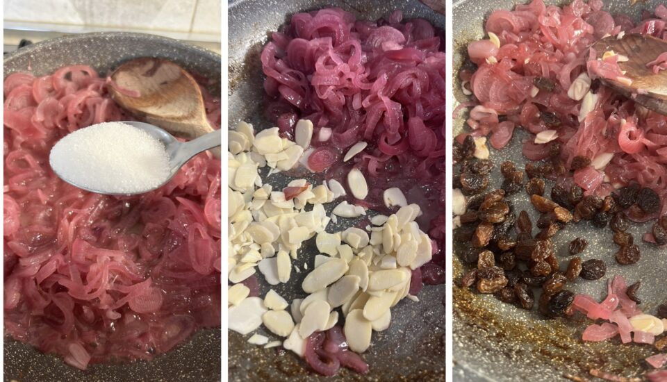 Raccogliete le cipolle su un lato della padella, aggiungete le mandorle lasciandole tostare un po’ e finite con l’uvetta. Lasciate andare qualche minuto sul fornello mescolando spesso e spegnete.