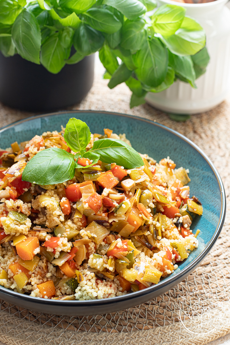 Il cous cous di verdure è un piatto semplice e colorato, preparato con tante verdure fresche tagliate a piccoli dadini e cotte lentamente con un filo di olio extravergine d’oliva. Zucchine, carote, peperoni, porro e funghi si uniscono in un condimento ricco di profumi e sapori che rende questo cous cous vegetariano leggero ma molto gustoso e potete scegliere e aggiungere tutte le verdure che preferite!