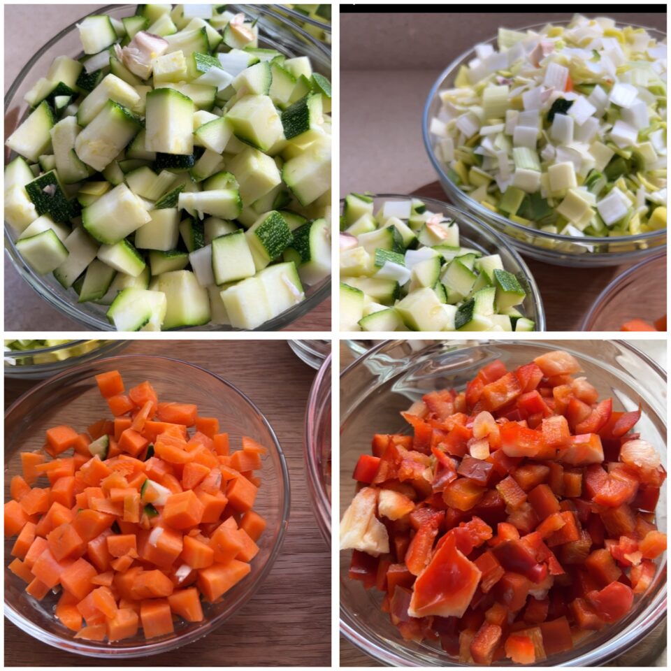 Per preparare il cous cous di verdure, iniziate lavando e preparando tutte le verdure. Tagliate il porro e riducete zucchine, carote, peperone e funghi a piccoli dadini, cercando di mantenerli più o meno della stessa dimensione in modo che cuociano in maniera uniforme. Io mi sono aiutata con un taglia verdure, per fare prima.