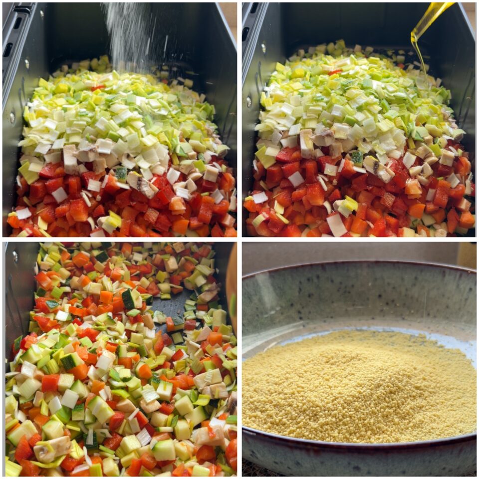 Per fare il cous cous di verdure ho scelto peperoni, porro, carote, zucchine, funghi champignon. Insomma, ciò che avevo in frigo, ma potete aggiungere cipolla, cipollotti, zucca, cavolfiori o broccoli, insomma, ci che preferite e ciò che è di stagione.