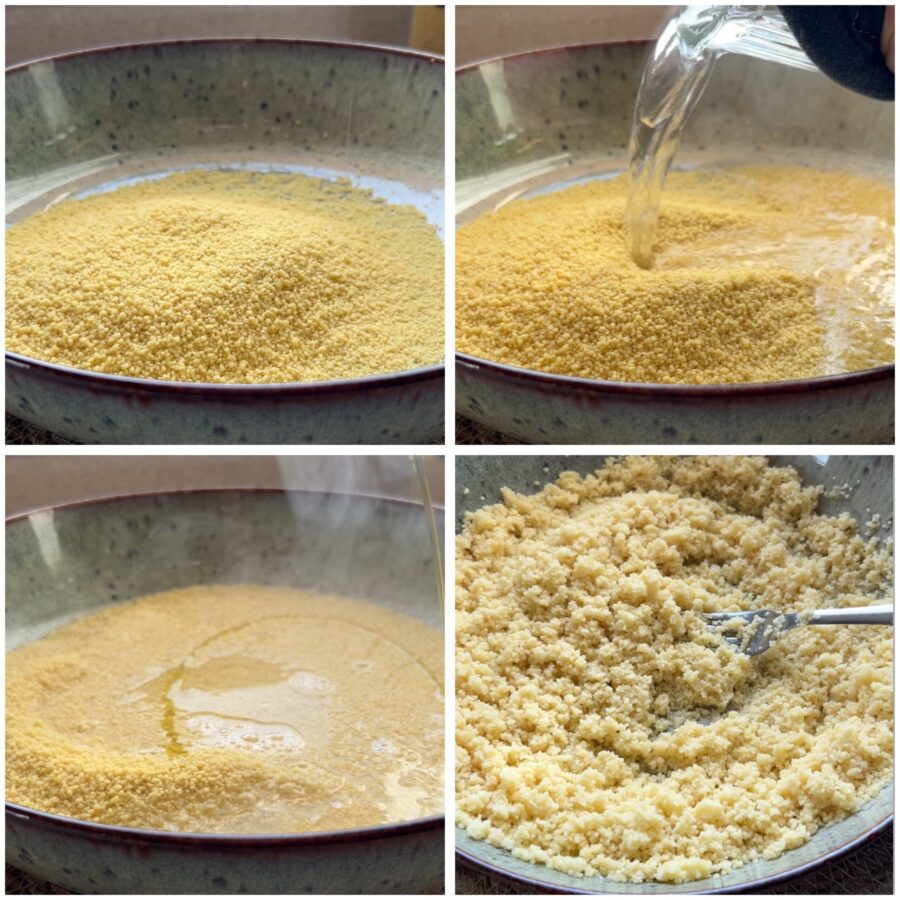 Nel frattempo versate il cous cous in una ciotola e copritelo con acqua bollente leggermente salata. Lasciatelo riposare per circa 5 minuti, poi sgranatelo bene con una forchetta.