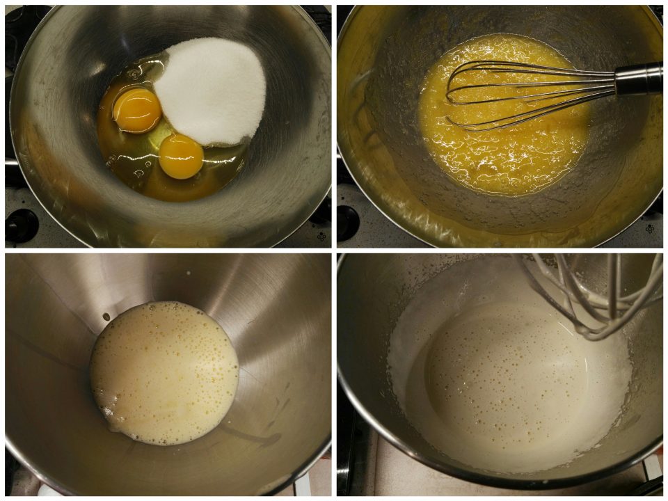 Aprite le uova e inseritele in una ciotola insieme allo zucchero, versate un po’ d’acqua in un pentolino e portatelo a bollore. Poggiate il contenitore con le uova sul pentolino, facendo attenzione che non vada a contatto con l’acqua, ma solo con il vapore. Lasciate scaldare le uova mescolando e girando con le fruste molto velocemente, misurate la temperatura e aspettate che si raggiungano 80°C. Non andate oltre perché si straccerebbero!