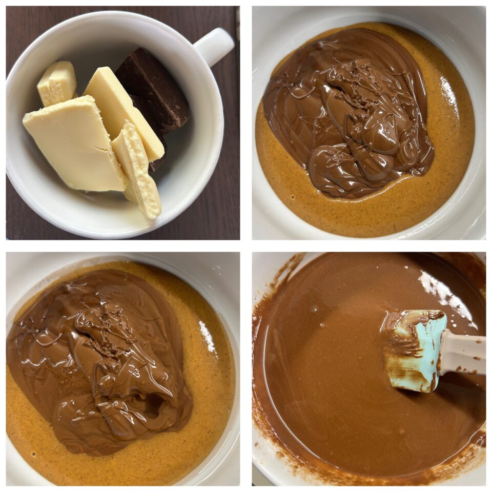 Fatta la base alla nocciola, sciogliete i due cioccolati a bagnomaria o al microonde a 750w per 1 o 2 minuti, mescolando ogni 20 secondi. Unite il cioccolato alla base di nocciole e mescolate.