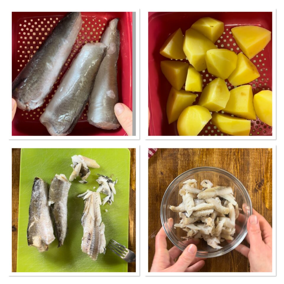 Cotto il merluzzo, pelate, sciacquate e tagliate a tocchetti le patate.