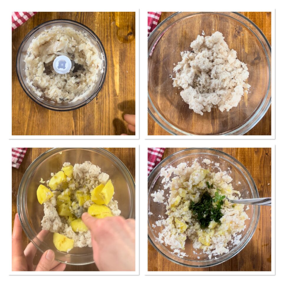 Sfilettate i merluzzi e privateli delle lisca centrale e dei lische più piccole raccogliete nel boccale del frullatore, aggiustate di sale, date un buon giro d’olio e frullate per qualche secondo. Raccogliete il merluzzo tritato in una ciotola e unite le patate schiacciate, sale, pepe, prezzemolo, rosmarino,