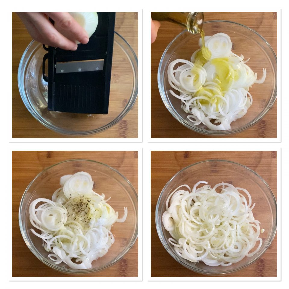Dopo aver affettato le cipolle dentro una ciotola, aggiungete olio, sale, pepe e 50g d’acqua. Mescolate, coprite con pellicola adatta al microonde e cuocete nel forno al microonde alla massima temperatura per 10 minuti.