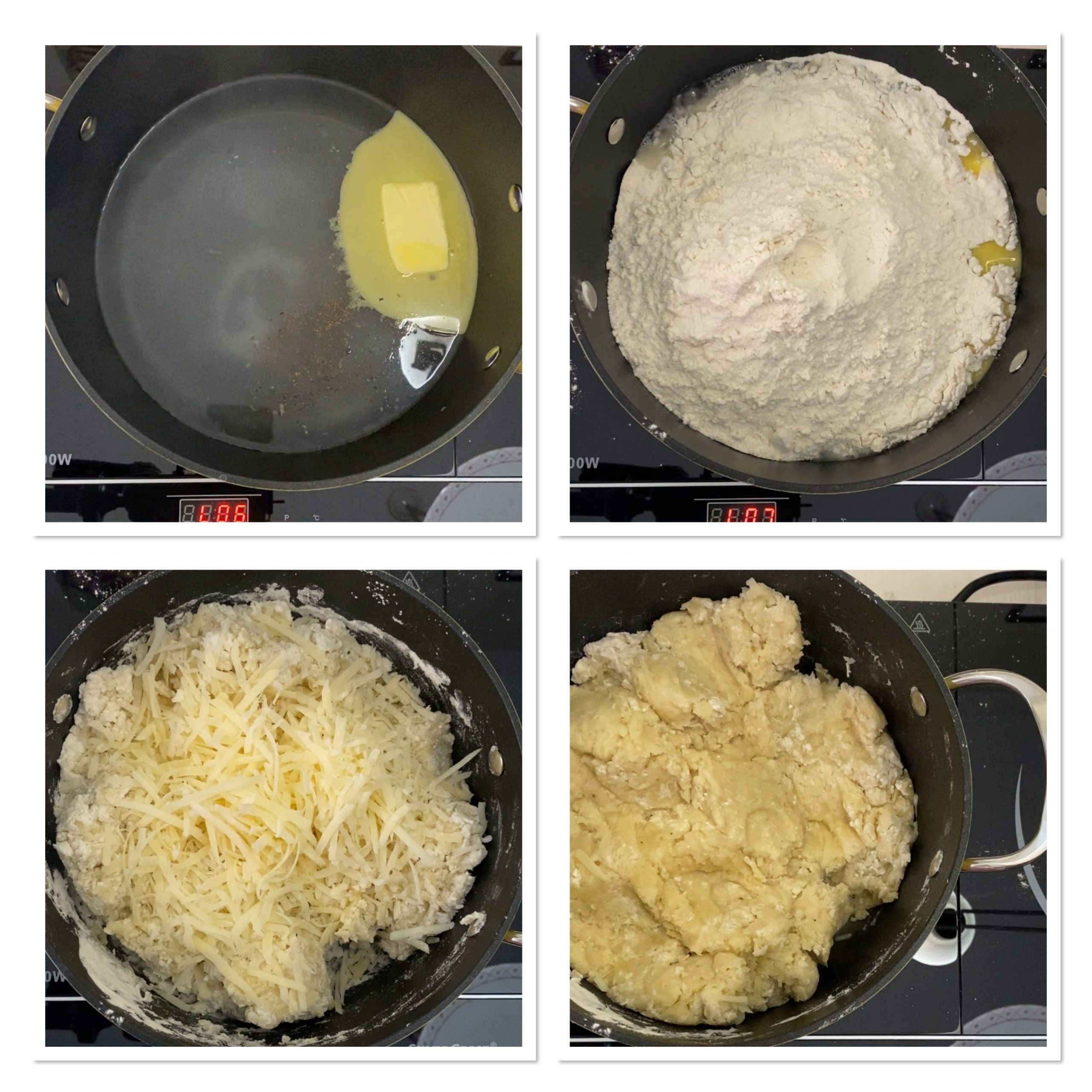 Appena l’acqua comincerà a bollire, abbassate la fiamma e aggiungete la farina (potete usare la semola, la 0 o la 00 o un mix di queste). Mescolate fino a che il composto si staccherà dalla pentola, basteranno pochi minuti. Unite il formaggio grattugiato, spegnete e continuate a girare con un cucchiaio di legno anche se sarà faticoso.