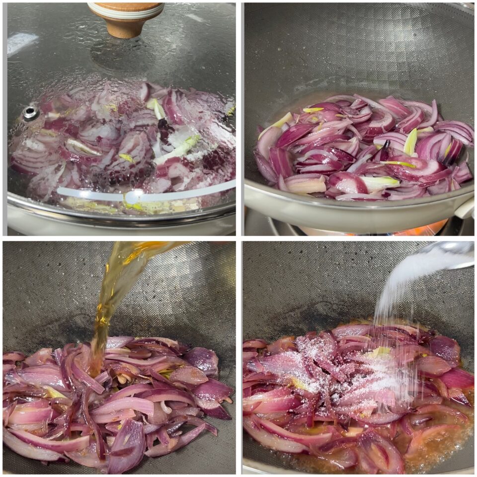 Nella stessa padella aggiungete un altro filo d’olio e unite le cipolle affettate sottilmente con un pizzico di sale. Coprite e lasciate appassire dolcemente per qualche minuto, finché saranno morbide e lucide.