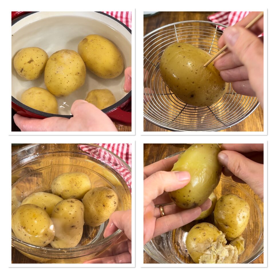 Raccogliete le patate in una pentola, coprite d’acqua, aggiungete il sale e cuocete per 35-40 minuti dal bollore o fino a che infilzandole con uno stecchino non risulteranno morbide, non lasciate che scuociano, piuttosto lasciatele un po’ indietro, continueranno a cuocere per inerzia. Scolatele e lasciatele raffreddare delicatamente a temperatura ambiente o in acqua a temperatura ambiente, cambiandola spesso.Non passatele sotto l’acqua fredda o ghiacciata perché si romperebbero.