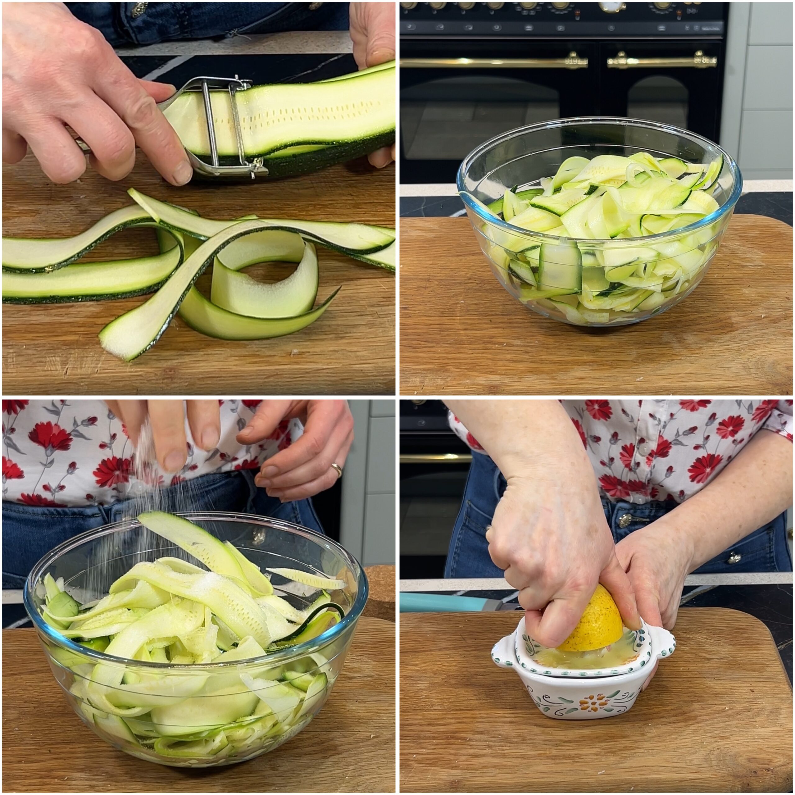 Lavate le zucchine e tagliatele a fette sottilissime con un pelapatate o una mandolina, ottenendo delle strisce lunghe e leggere. Raccoglietele in una ciotola, salatele leggermente e lasciate riposare qualche minuto.