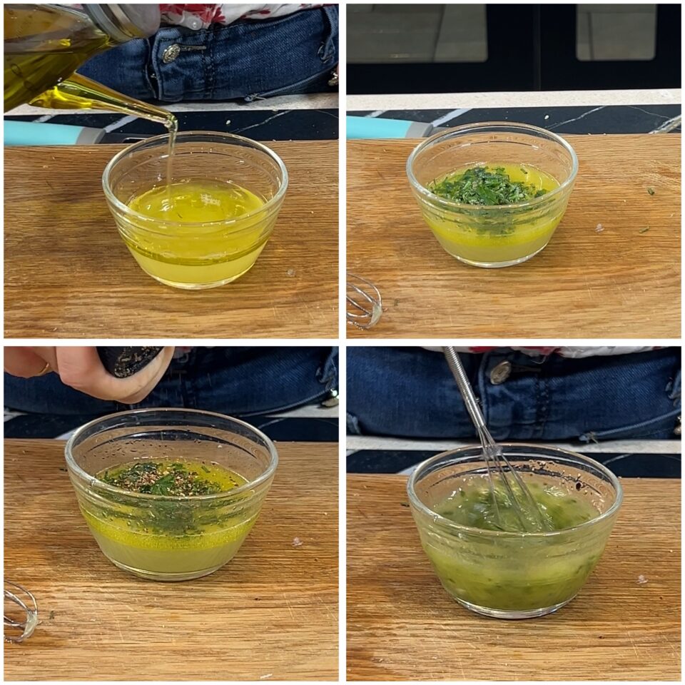 Nel frattempo preparate un’emulsione mescolando olio extravergine d’oliva, succo di limone, prezzemolo tritato e una macinata di pepe. Sbattete bene con una forchetta fino ad ottenere un condimento profumato e ben amalgamato.