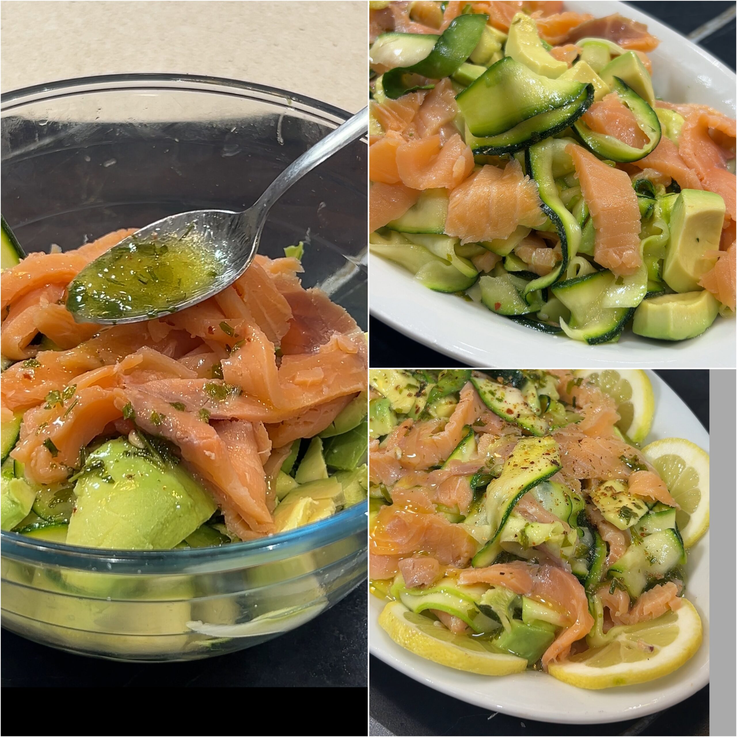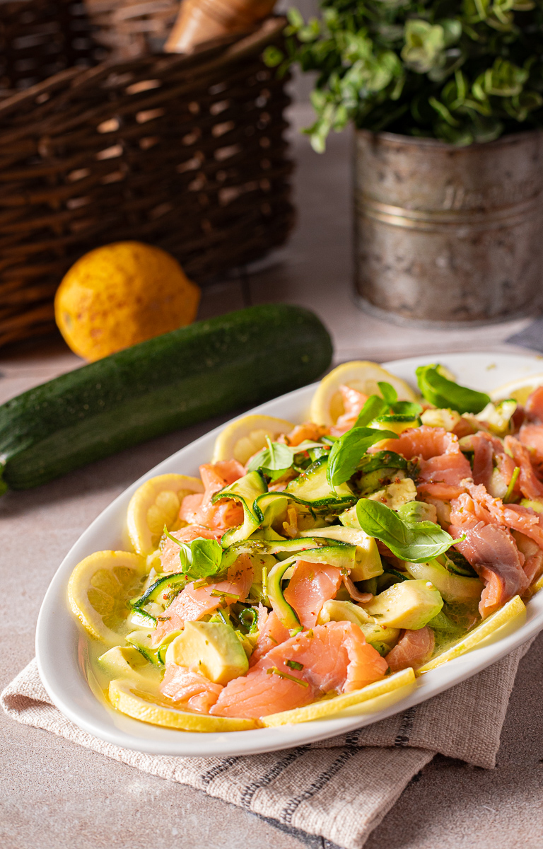 Le zucchine crude, tagliate sottilissime con un pelapatate o una mandolina, diventano tenere e saporite grazie al condimento con limone e olio extravergine d’oliva, restando comunque piacevolmente croccanti. Le zucchine preparate cosi, si abbinano perfettamente al salmone e all’avocado, creando un equilibrio di sapori delicati ma completi, che piace a tutti.