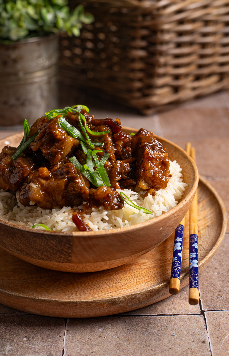Finalmente ho deciso di proporvi un altro comfort food irresistibile, un piatto dal sapore intenso e dal colore rosso scuro, che ha molto in comune con il più famoso hóngshāoròu. In particolare qui ritroviamo l’utilizzo della salsa di soia scura e i lunghi tempi di cottura, indispensabili per ottenere una carne tenerissima, capace di sciogliersi in bocca, avvolta da una salsa densa e saporita.