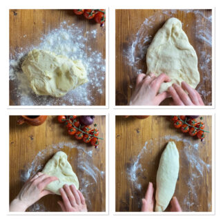 Ribaltate l’impasto sulla spianatoia, sgonfiatelo, allaragatelo formando un rettangolo e arrotolate formando un cilindro.